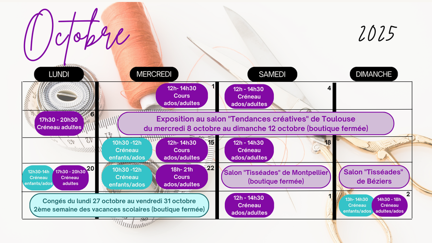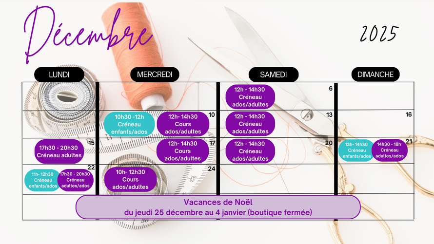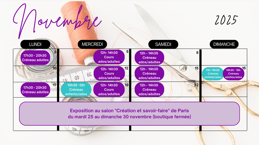 Découvrez ou faites découvrir les cours de couture proposés chaque mois à l'atelier grâce à ces cartes horaires !