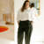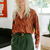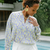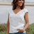 Une blouse à l’encolure dégagée fermée par de petits liens très féminins, une coupe ni trop ample ni trop ajustée, un bas de manche avec un large ourlet